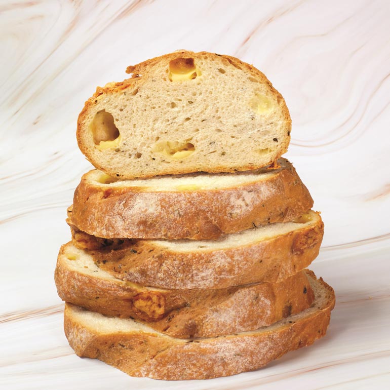 Dit is het meest favoriete brood ever van onze bakklanten. Als dit brood op het menu staat, zien we ineens weer mensen die we een tijdje niet gezien hebben. Tegenwoordig moeten we een kaaswiel van 11 kilo kopen, zodat iedereen aan zijn kaastrekken kan komen. Het is een echt ambachtelijk brood, waarin je de blokjes kaas nog kunt zien wanneer je een plak afsnijdt. Gebruik dus absoluut geen zakjes geraspte kaas!, aldus Jayne Jubb.