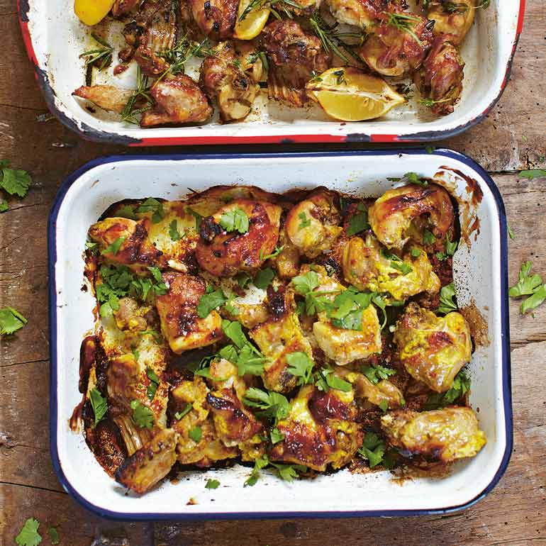 1. Meng 6 el yoghurt, het sap van 1 citroen, 2,5 cm geraspte gemberwortel, 3 tenen knoflook, gepeld en geraspt, 1 tl komijnpoeder en 1 tl zout en ¼ tl (van elk) garam masala, kurkuma en cayennepeper.