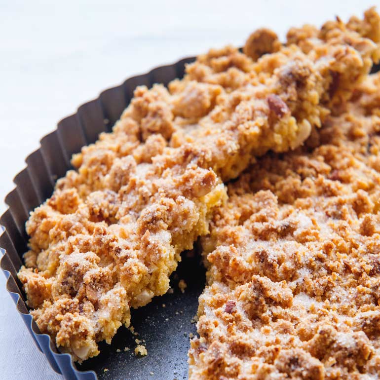 Het is bij dit kruimeldeeg belangrijk dat je snel werkt en het deeg niet te veel kneedt, zodat het niet opwarmt. Het is niet erg als het deeg niet helemaal glad is. Hierdoor krijg je de brosse structuur die zo kenmerkend is voor de sbrisolona.