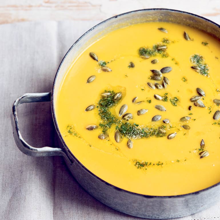 Met dit koude weer krijg je meteen zin in soep. Een variant die je misschien nog niet eerder geproefd hebt, is de pompoen-limabonensoep. De natuurlijke zoetheid van de pompoen, die trouwens wordt versterkt door de groenten te roosteren, verwarmt je meteen, en de salieboter en geroosterde pompoenpitten geven de soep een lekkere bite.