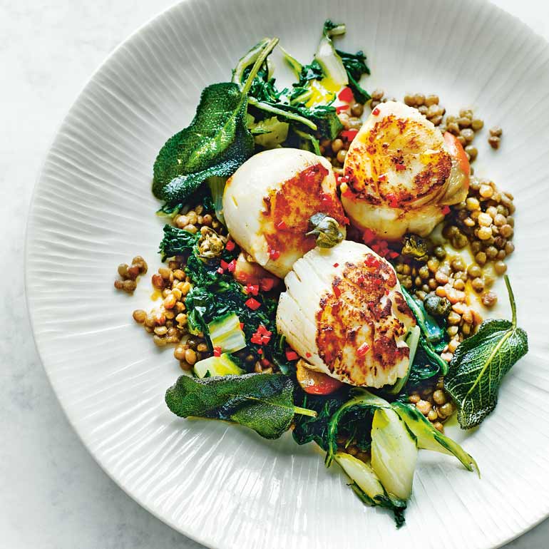6. Voeg de kappertjes, chilipeper, salieblaadjes en het citroensap toe. Serveer de sint-jakobsschelpen warm, met de linzen en snijbiet.